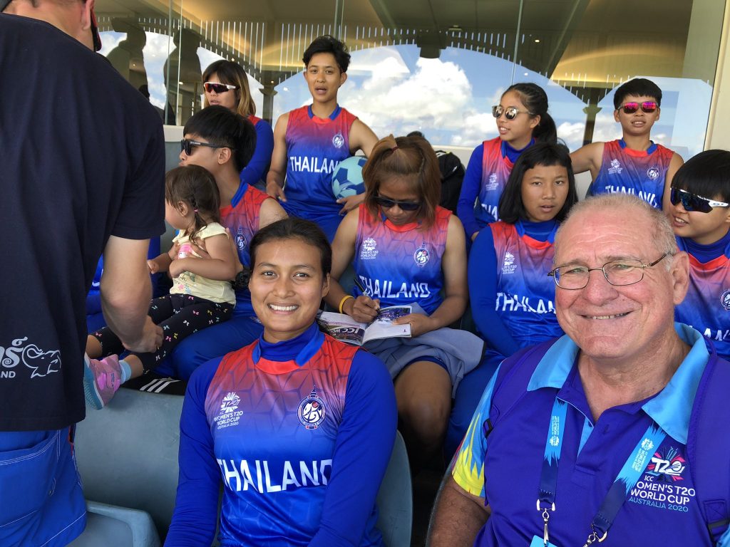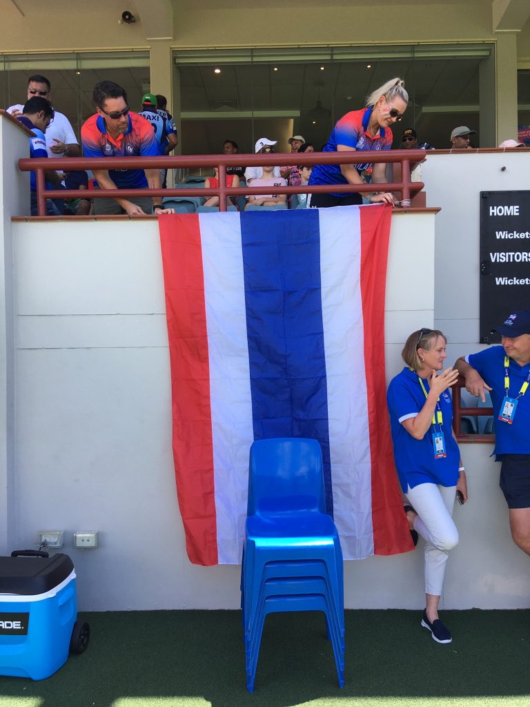 The team’s Liaison Officer from the ICC Women’s T20 Global Qualifiers in Scotland is at the ground. He has timed a holiday in Brisbane with the team’s stay here. He and his wife unfurl a giant Thai flag over the front the Stuart Law stand.