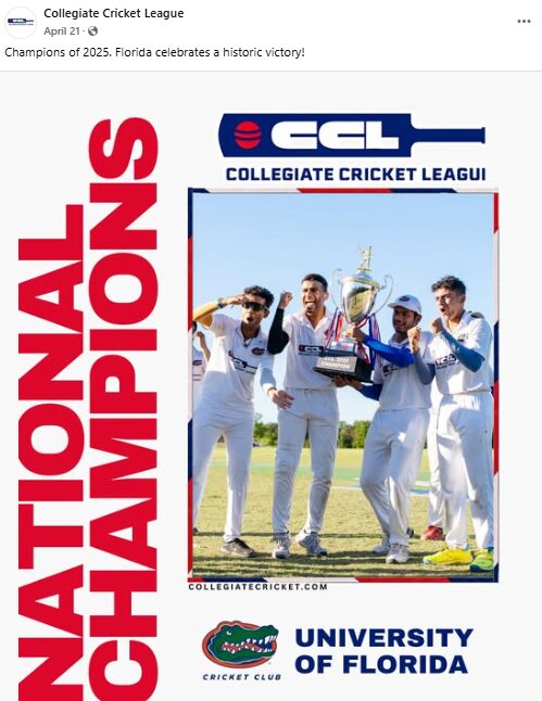 On the field, college cricket clubs competed for three national championships in Spring 2025: the National College Cricket Association National held two separate T20 championships, and the Collegiate Cricket League (CCL) convened an inaugural 10-over championship. The latter is of potential significance to college cricket. Specifically, the CCL is partnered with the Sachin Tendulkar-backed National Cricket League and endorsed by USA Cricket. The CCL’s 10-over tournament is central to the organization’s wider effort to transform college cricket in the United States by encouraging institutions to elevate cricket programs to varsity status.
