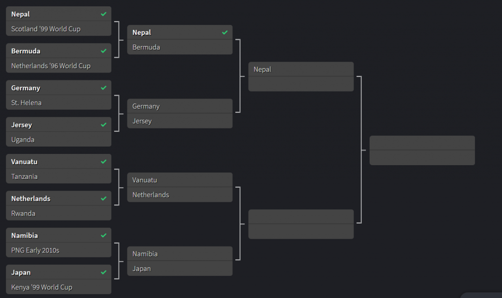In the other matches of the knockout rounds Scotland fought bravely against a giant in the kit World Cup, though it was the heavy public strength of Nepal that edged things. Bermuda were also too strong for the Dutch 1996 World Cup kit, with Germany too strong for St. Helena. Jersey and Uganda both garnered great support throughout the 24 hours with the two highest votes of the the competition thus far, though it was Channel Islanders who pushed away late in their matchup. Vanuatu, making the most of their recent public support, brushed Tanzania aside, with the Netherlands, Namibia and Japan locking up the final spots.