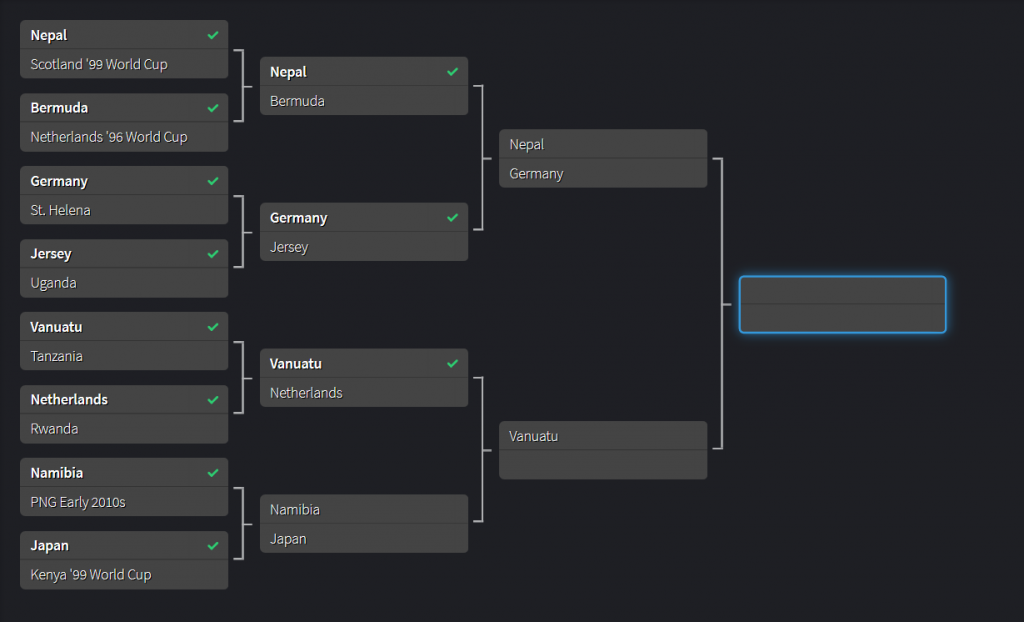 In the other quarter-finals, Nepal faced some stiff competition from a brave Bermuda who won on the Twitter vote, though the strength across Facebook was enough for the favourites to progress. Quarter-final two had the biggest voting numbers of the tournament thus far, as Germany and Jersey went toe-to-toe. Germany’s Facebook vote saw them through, as they booked the second semi-final spot.