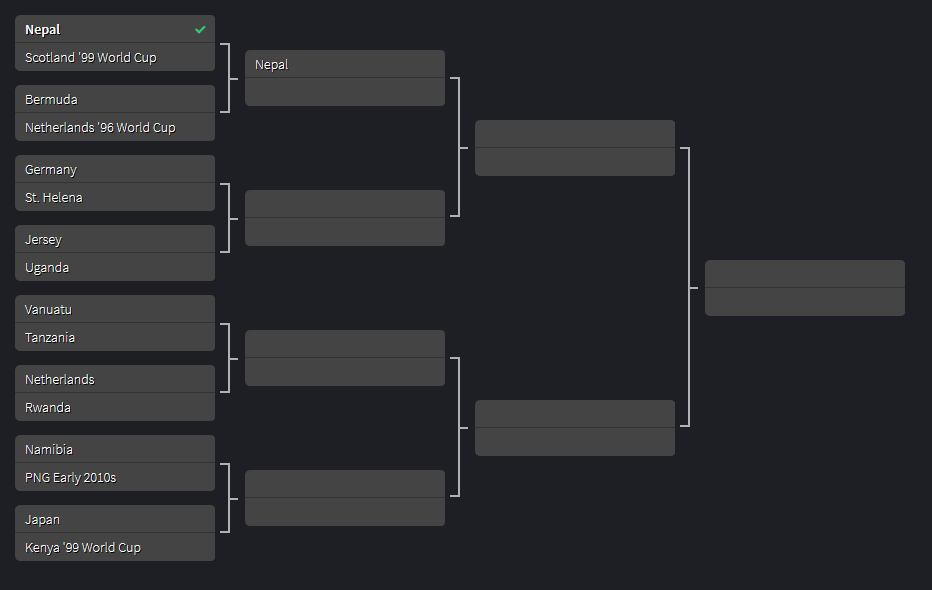 Tanzania and Nepal progressed from Group A, while Vanuatu and Scotland 1999 progressed in Group B. The Pink of Bermuda stormed home and Rwanda scraped enough votes across Twitter and Facebook to squeeze through in Group C and Group D was domination by the Dutch, with both the current kit and the 1996 World Cup shirt running away from the field to advance.
