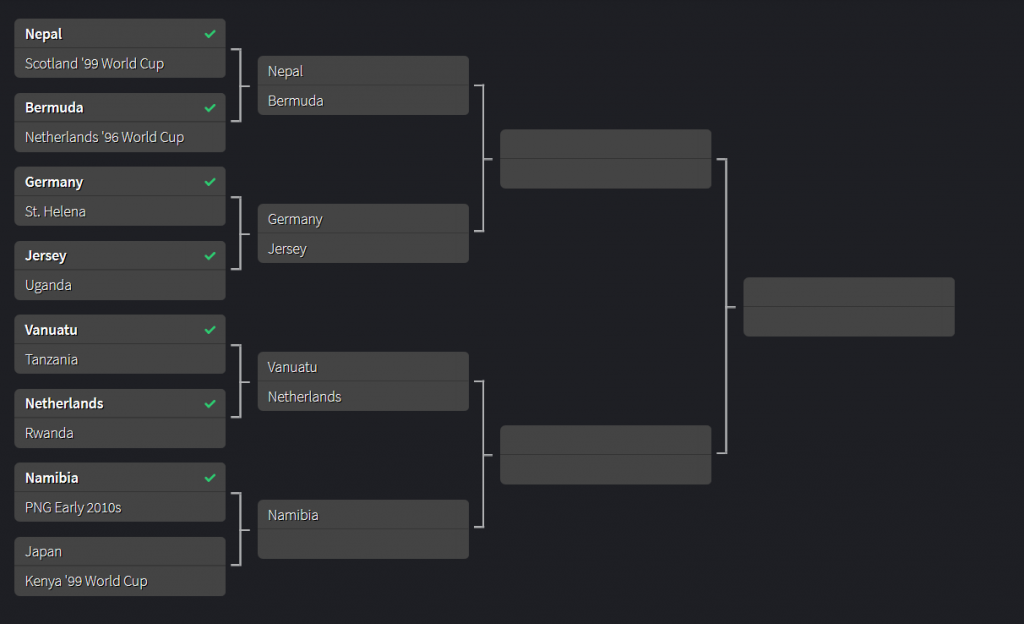 Tanzania and Nepal progressed from Group A, while Vanuatu and Scotland 1999 progressed in Group B. The Pink of Bermuda stormed home and Rwanda scraped enough votes across Twitter and Facebook to squeeze through in Group C and Group D was domination by the Dutch, with both the current kit and the 1996 World Cup shirt running away from the field to advance.