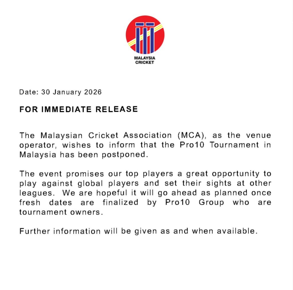 “The Pro10 Malaysia cricket tournament has been postponed to a later date, post ICC T20 Cricket World Cup in India, due to logistical issues,” the statement began.