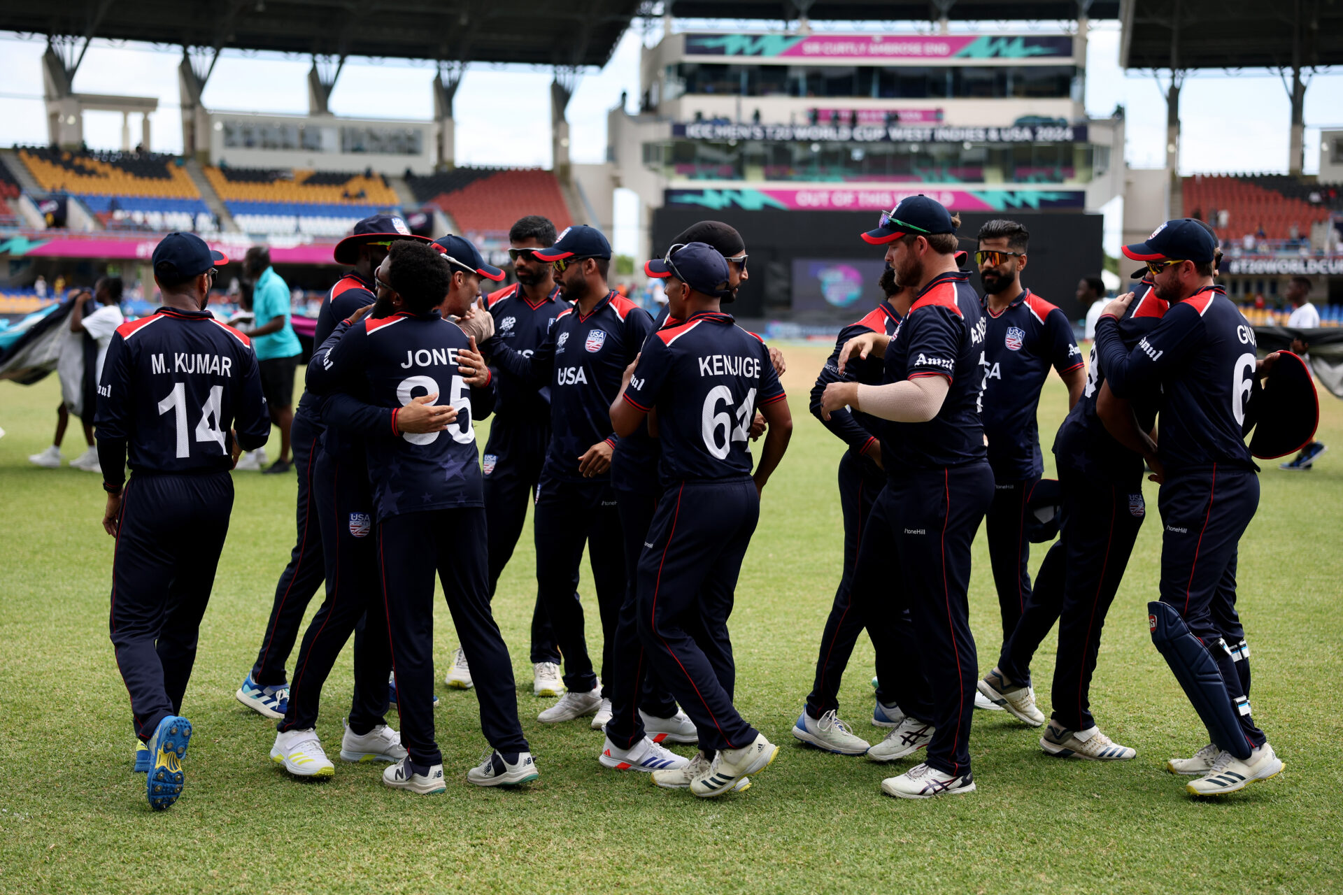 ANTIGUA, ANTIGUA AND BARBUDA - JUNE 19: USA players shake hands ahead of the ICC Men's T20 Cricket World Cup West Indies & USA 2024 Super Eight match between USA and South Africa at Sir Vivian Richards Stadium on June 19, 2024 in Antigua, Antigua and Barbuda. (Photo by Jan Kruger-ICC/ICC via Getty Images)