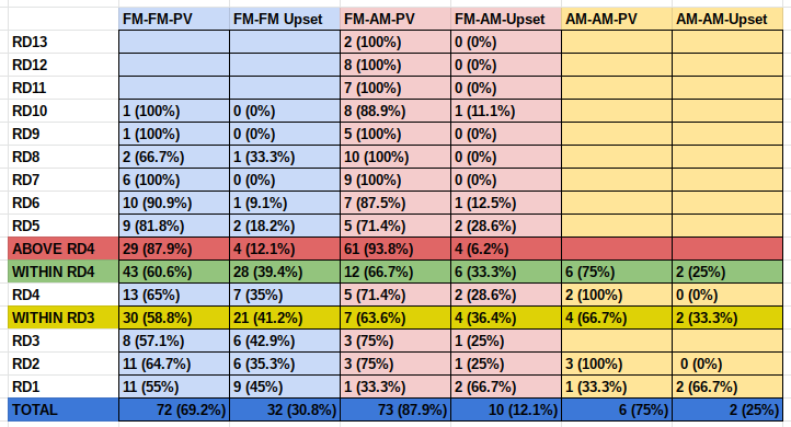 The other relevant factor is that of rankings. With top AMs closing the gap to weaker FMs (to the point where it barely exists anymore), the relative position of teams on the rankings table becomes a more accurate predictor of the likely outcome than membership status.